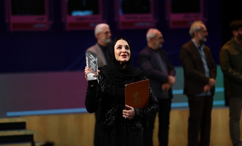 عکس اصلی خبر، تصویر سولاف فَواخرجی (سرزمین فرشته‌ها) برنده سیمرغ بلورین، دیپلم افتخار و جایزه ویژه هیات داوران در بخش بهترین بازیگر نقش اصلی زن است. (عکس‌ها از کانال تلگرام جشنواره فیلم فجر.)
