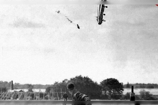 هنگامی که هواپیمای XG۳۳۲ در ارتفاع حدود ۶۱ متری در حال فرود بود، ناگهان دماغه هواپیما بالا رفت و خلبان مجبور به خروج اضطراری شد. به دلیل آتشسوزی در موتور، کنترل هواپیما از دست رفته بود. جیم میدز توانست درست در همان لحظه عکس بگیرد: خلبان وارونه در هوا، چتر هنوز باز نشده، و هواپیما در حال سقوط در نزدیکی او. راننده تراکتوری که در عکس دیده میشود، صدای صندلی پرتاب را شنید و سریع برگشت تا ببیند چه اتفاقی افتاده. راننده یک نوجوان ۱۵ ساله بود که در تابستان آن سال در آنجا کار میکرد. او برای عکس ژست نگرفته بود؛ برعکس، در حال گفتن این بود که عکاس باید از آنجا دور شود.
